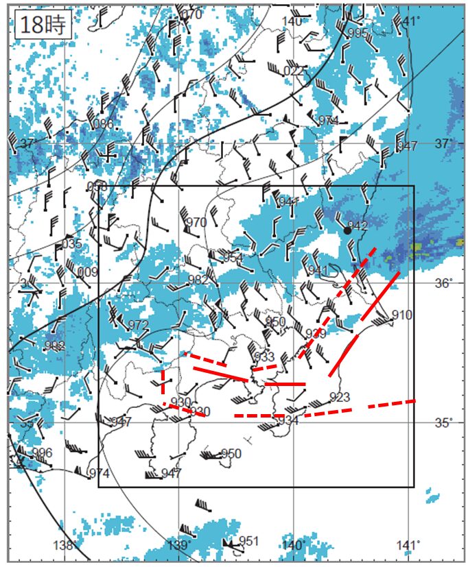 念のため、よく考えたい方のために、渡島半島付近にあった前線が18時にどこにいるかを考えてみましょう。