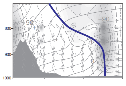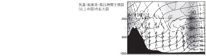 またその範囲での風の鉛直分布に着目すると、上空に向かって南西風が10から30、40ノットと強まっています。