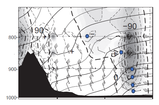 上昇流域に対応する強風軸の高度を読み取ります。