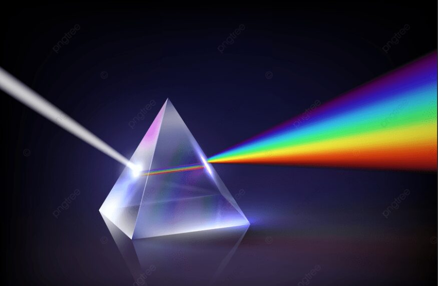 たとえば、プリズムに光を通すと、虹のように色が分かれて見えます。