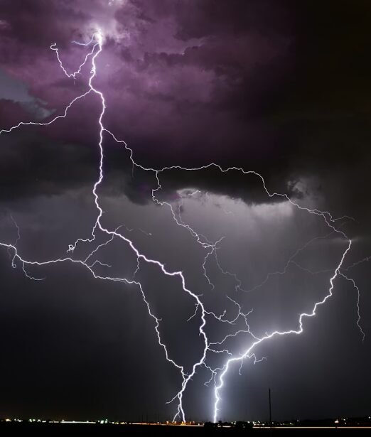 雷は、大量の電気が一瞬で空気中を流れる現象。